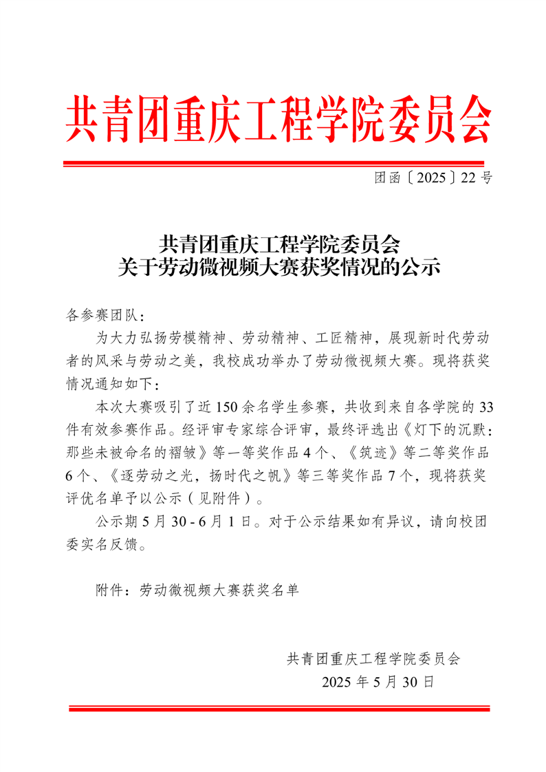 共青团重庆工程学院委员会关于劳动微视频大赛获奖情况的公示