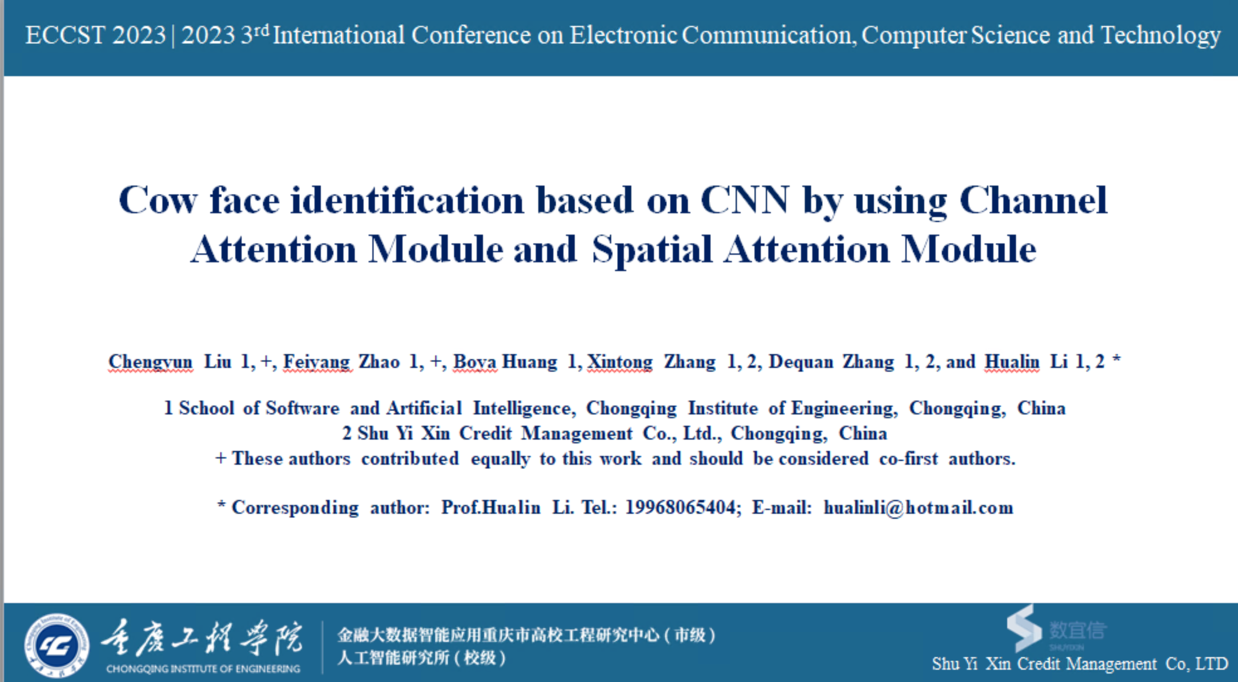 我校软件与人工智能学院人工智能研究所所长、重庆数宜信信用管理有限公司风控中心总经理李华林博士受邀参会,同时于9月16日就其团队的研究成果作了题为“基于神经网络的时间和空间多通道注意力机制的牛脸识别”的学术报告,得到了与会专家的高度认可和肯定。