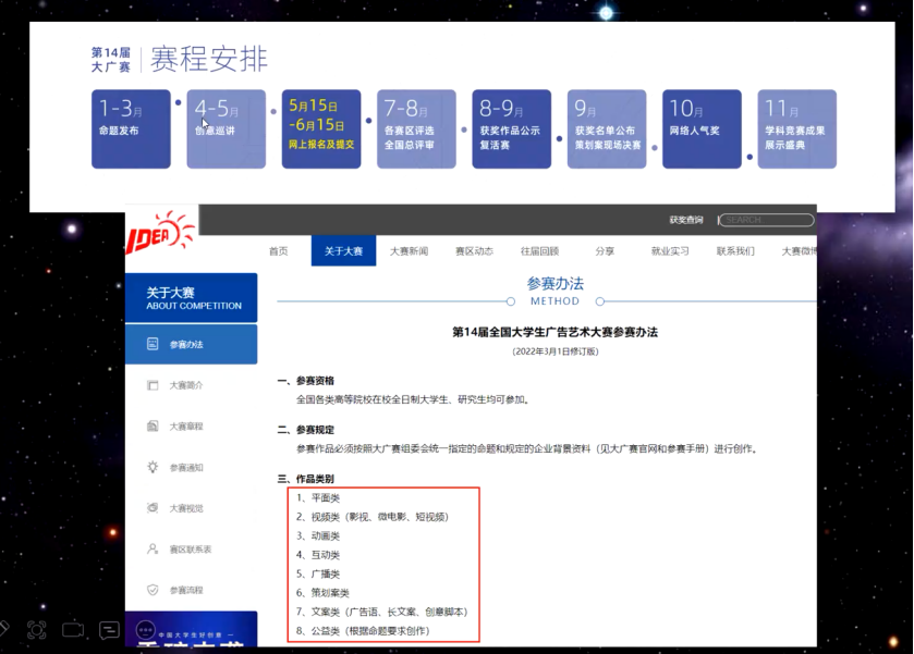 2022年4月6日17:40-18:30,数字艺术学院开展了第14届全国大学生广告艺术大赛校内启动会,因疫情防控需要在腾讯会议线上开展。本次会议由数字艺术学院杨明慧老师主讲,有来自数字艺术学院、管理学院、软件学院的323人参会,杨老师从为什么要参与各类学科竞赛、大广赛简介与参赛注意事项、行业关联与岗位需求、同学经验分享四个主题展开。
