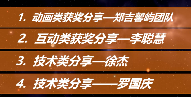来自数字艺术学院动画类获奖分享,19动画1班郑吉馨屿团队;互动类获奖分享,20网媒1班李聪慧团队;技术类分享,19网媒2班徐杰同学、20网媒6班罗国庆同学。借此机会为同学们营造了大赛经验分享、技术交流的契机,参会同学汲取了更多优秀经验,激发同学们的创作激情。为后续大赛的开展与优秀作品的培育提供了机会。