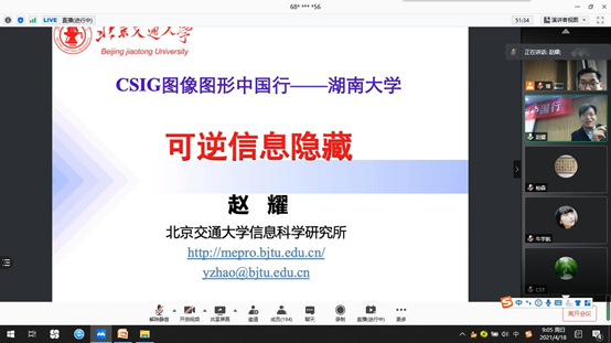 2021年4月18日,大数据与人工智能学院人工智能系系主任廖宁老师、柏森教授等参加了由中国图象图形学学会(CSIG)主办,CSIG数字媒体取证与安全专委会、湖南大学承办的CSIG图像图形中国行线上学术交流会。中国行活动旨在推动图像图形学科的普及,加强各高校科研以及与企业间的合作交流,至今已经成功举办60多起。该活动首次在湖南大学召开,来自全国各地近300余名专家、学者和学生代表以线上、线下相结合的形式参加了会议,就多媒体内容安全领域的最新研究热点进行了交流与讨论。