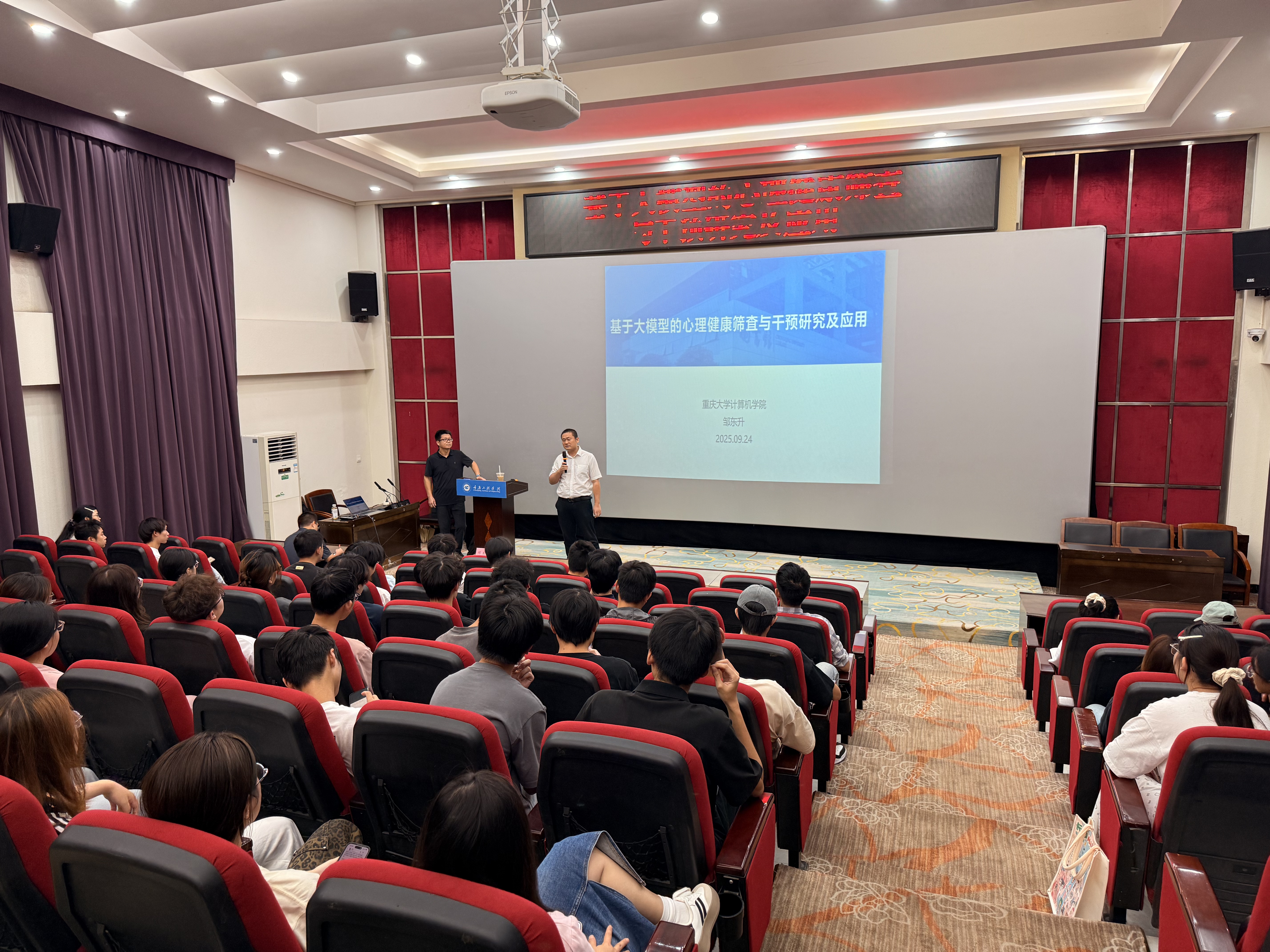 本网讯(文/图 大数据技术与应用研究所 马凯)为帮助师生深入了解大模型技术的前沿应用,大数据技术与应用研究所于9月24日下午在办公楼报告厅成功举办专题讲座,特邀重庆大学计算机学院邹东升副教授担任主讲。邹教授以“基于大模型的心理健康筛查与干预研究及应用”为题,系统介绍了大语言模型在心理健康领域的创新研究与实际应用进展。讲座由研究所所长何宏靖主持,大数据与人工智能学院副院长吴平及学院师生共计百余人参加。
