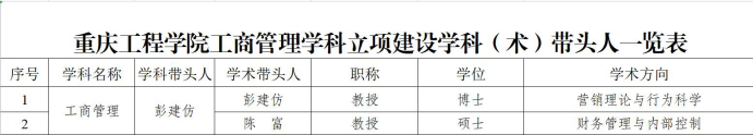 近日,管理学院工商管理学科获重庆工程学院校级一般学科建设立项,工商管理学科由“营销理论与行为科学”和“财务管理与内部控制”两个方向组成,同时,学校也针对学科带头人的资格进行了论证,最终选定彭建仿教授为工商管理学科的学科带头人,以及“营销理论与行为科学”的学术带头人,陈富教授为“财务管理与内部控制”的学术带头人。