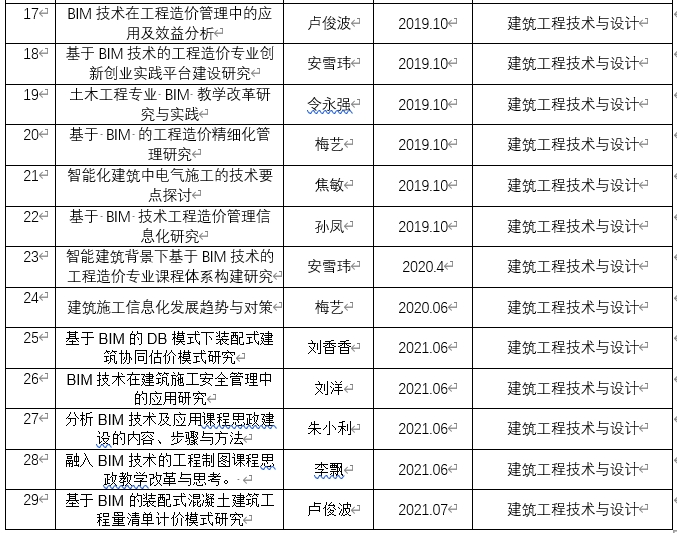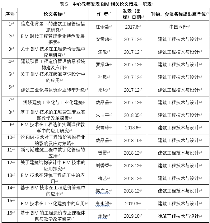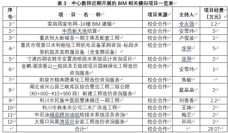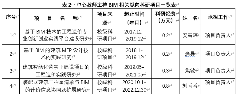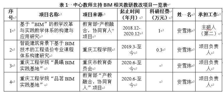 BIM创新中心自2018年成立以来,中心成员主持及承担了BIM相关纵横向项目10余项,合同金额12余万元;主持及承担的BIM相关教研教改项目6项,成功完成了重庆市高校在线开放课程平台上“BIM建模技术应用”课程项目建设,发表BIM技术及应用相关论文30余篇。
