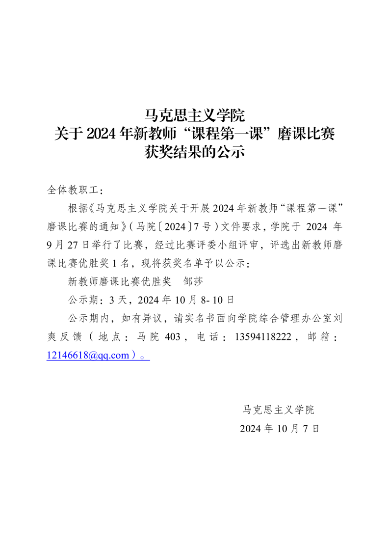 马克思主义学院关于2024年新教师“课程第一课”磨课比赛 获奖结果的公示