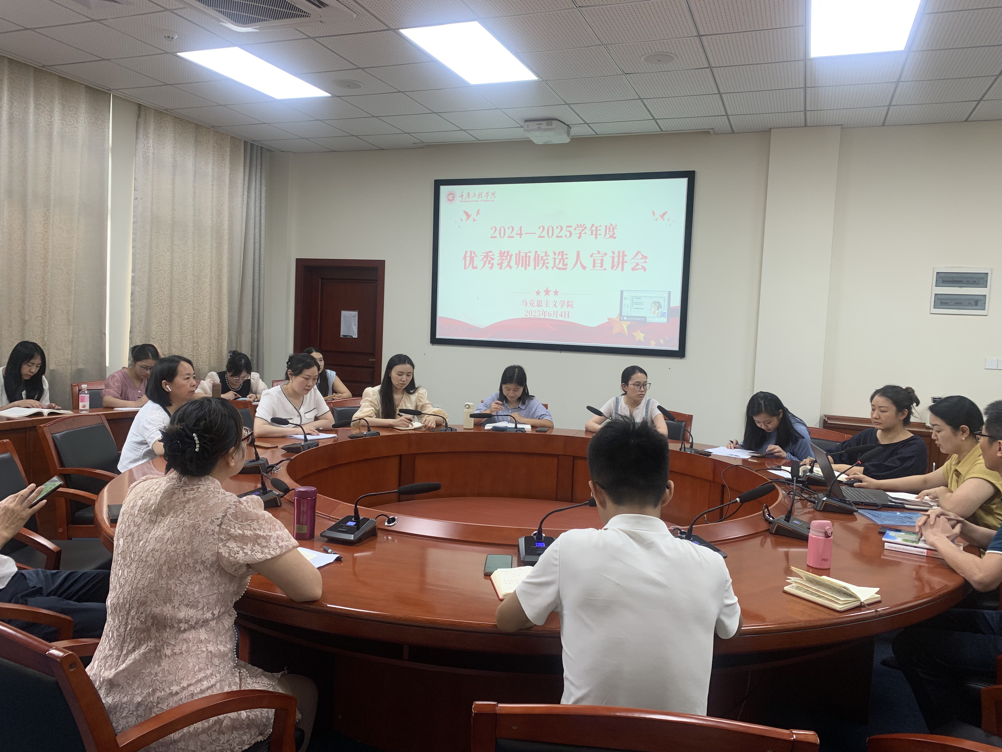 本网讯(文/马克思主义学院 刘爽 图/罗舒)为进一步加强教师队伍建设,充分发挥先进典型的示范引领作用,马克思主义学院于 6 月 4 日在行政楼 107 会议室召开 2024-2025 学年先进个人候选人宣讲会。会议由学院党总支书记、副院长王巧玲主持,全体教师参加。