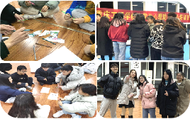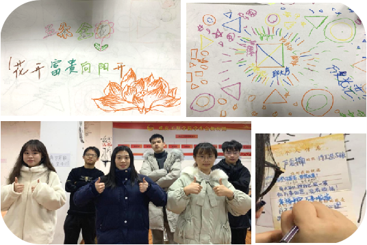 接下来进入完成任务的竞赛环节,本环节有三个子活动,一是听从主持人的指令,小组合作绘画,感受沟通的要点,二是列队从后往前书写绘画,头脑电报传递,感受信息传递信息的流失和补充,三是人体字母,感受全体沟通的有效性,增强团队的荣誉感;最后的环节是对本次团辅活动和本学期的心理工作进行总结和升华,以此迎接新年,通过祝福卡从积极的角度看待工作和活动,通过惊喜抽奖小活动将整个活动的气氛推向高潮。