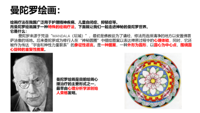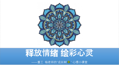 首先,杨老师先介绍了曼陀罗绘画的由来,引导同学们进行了放松训练,并讲解了绘画流程和注意事项,然后在轻音乐的伴随下在自己准备的白纸上进行绘画涂色,同时写下自己绘画时的所想所感并命名绘画,最后由老师带领大家对绘画进行简要的分析,了解和调节自我的情绪状态。