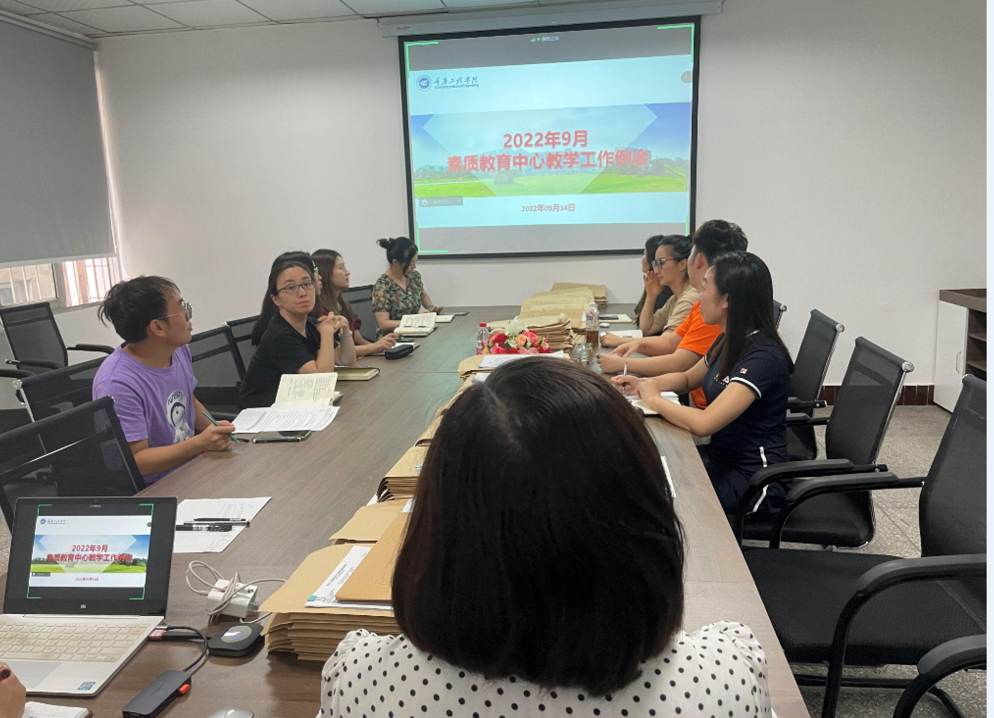 本网讯(大学生素质教育中心 夏冬梅)2022年9月14日下午,大学生素质教育中心全体教职工在415召开9月线上线下混合式教学工作例会。根据疫情防控要求,开学第一周采取线上教学模式,督导员对中心全体教师线上课程进行了听课检查。从督导组反馈的总体情况来看,中心开学第一周线上教学运行平稳有序,教风、学风良好,师生精神饱满,圆满完成开学第一周教学、学习任务。全体教师线上教学准备充分,实现了线上教学质量稳中精进。同时,在教学督导工作过程中,督导组对中心课程线上教学过程监控有效性、线上教学资源建设丰富度、线上教学学生参与度等各方面提出了更高要求。