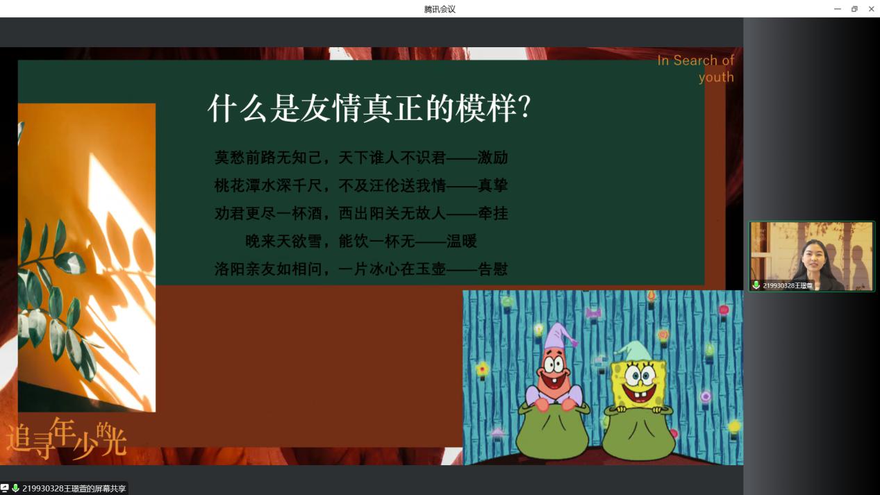 李恩溪同学以曹雪芹、泰戈尔的作品为引,为同学们介绍了书籍《云边有个小卖部》,让同学们明白了生活要且行且珍惜。刘洁同学为大家介绍了厦门的旅游攻略,让同学们了解到了厦门旅游的小技巧。鲜奇志同学为同学们介绍了阅读小技巧,让同学们了解了高效阅读的意义。陈美金同学以邓紫棋的歌曲《多远都要在一起》为例,为同学们介绍了流行音乐与电子音乐,让同学们了解到了音乐背后的故事与意义。付钰同学以为我们介绍了演讲小技巧,让同学们了解到了演讲时的手势与演讲前的放松小技巧。王景萱同学阐述了什么是友情,让同学们感受到了友情的温暖。