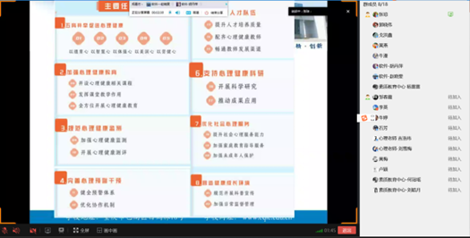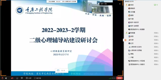 为进一步深入推进我校心理育人工作落实走深,引导学院提升心理育人成效、加强心理工作研究,推进我校心理健康教育精品化、科学化发展,最终形成以学生心理素质发展为核心、全员参与的心理育人工作新格局。按照《高等学校学生心理健康教育指导纲要》的工作要求,学生工作处决定试点建设学院(部)二级心理辅导站,心理健康教育教研室于2023年5月17日下午4点-5点通过QQ视频召开2022-2023-2学期二级心理辅导站建设研讨会,本次研讨会共计8人参加。
