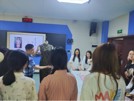 旗袍传入重庆后,历经百余年发展,结合地方服饰特点,形成了极具特色的渝派旗袍。本次活动邀请重庆“渝芳”旗袍与盘扣传统制作技艺非遗传承人——方志文,为我校师生带来一场实践操作性很强的旗袍制作技艺宣讲及体验活动。方志文老师通过展示各种完整款式的新中式和古典旗袍引入,详细介绍了各种款式旗袍的特点与制作难点。