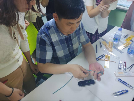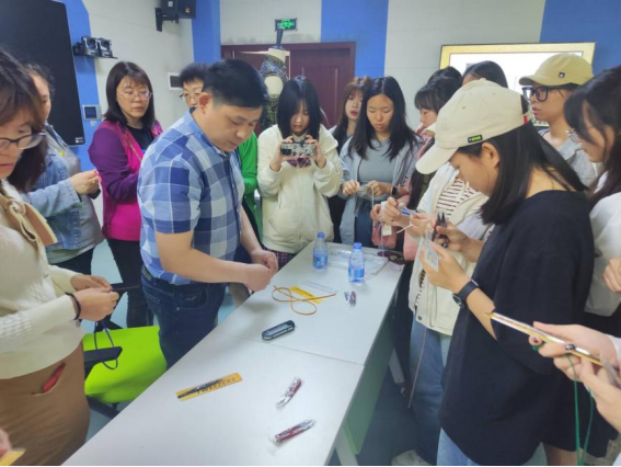 随后,方志文老师现场教学,指导师生体验精巧且极具特色的非遗技艺——旗袍盘扣制作。他依次展示了盘香扣、梅花扣、蝴蝶盘扣制作方法,并分发材料,手把手教学,帮助老师与同学们制作出一个又一个精美成品。大家表现出了极高的热情,以致原本2小时的体验活动时间,又延长了1个半小时。