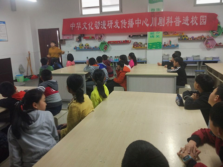 2018年4月8日,中华文化动漫研发传播中心开展“川剧科普进校园”主题活动。本次活动在南温泉小学篮球馆及各美术教室举行,共计赠送川剧基础知识视频光盘20张,开展川剧知识普及讲座3场。活动期间,中华文化动漫研发传播中心志愿者细心为南温泉小学师生讲解川剧知识,介绍川剧服饰、脸谱,并组织了学生画脸谱比赛,“我眼中的川剧”演讲比赛,南温泉小学师生积极参与,热情高涨,活动现场异常热闹。
