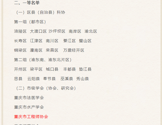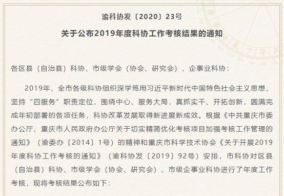 本网讯(文/刘益明)近日,根据《中共重庆市委办公厅、重庆市人民政府办公厅关于切实精简优化考核项目加强考核工作管理的通知》(渝委办〔2014〕1号)的精神和重庆市科学技术协会《关于开展2019年度科协工作考核的通知》(渝科协发〔2019〕92号)安排,市科协对区县(自治县)科协、市级学会(协会、研究会)、市级企事业科协进行了年度工作考核。根据评比结果显示,我校科协考核工作在市级学会中荣获2019年度一等奖!
