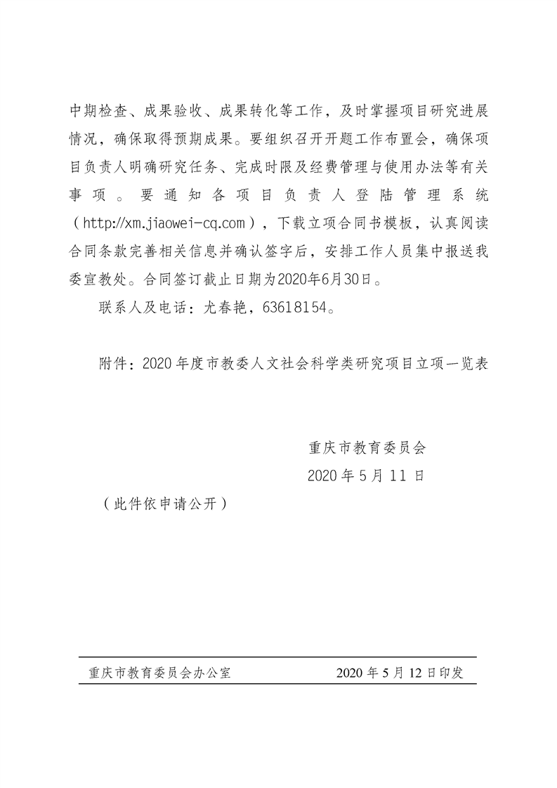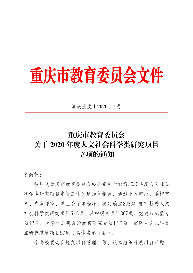 关于下达重庆市教育委员会2020年度人文社会科学类研究项目立项的通知