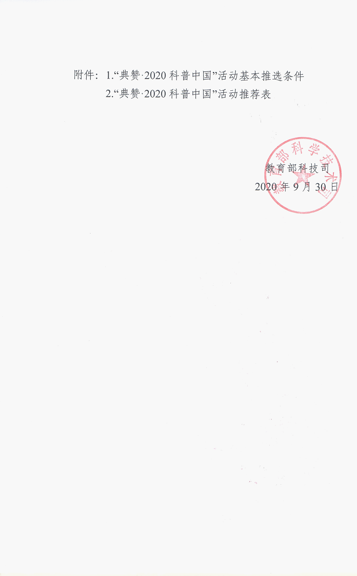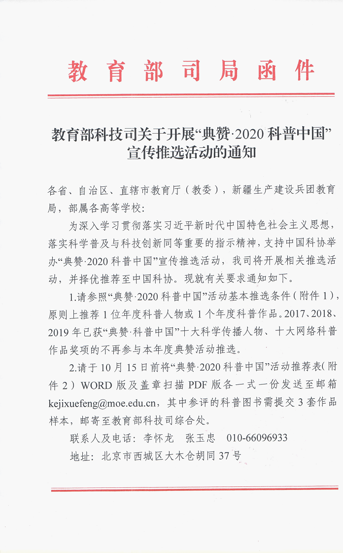 教育部科技司关于开展“典赞·2020科普中国”宣传推选活动的通知