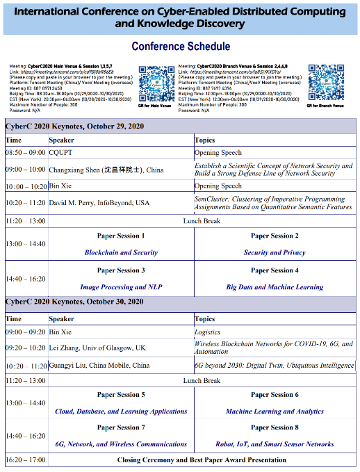 第12届网络分布式计算与知识发现国际会议CyberC 2020涵盖AI/ML、 Blockchain、Big Data、Image和6G,由重庆邮电大学主办,我校协办,华为、中兴等企业支持,会议将于10月29-30日举行。请登录腾讯会议参会,详细会议议程、会议ID、会议介绍等信息请见文后附件。