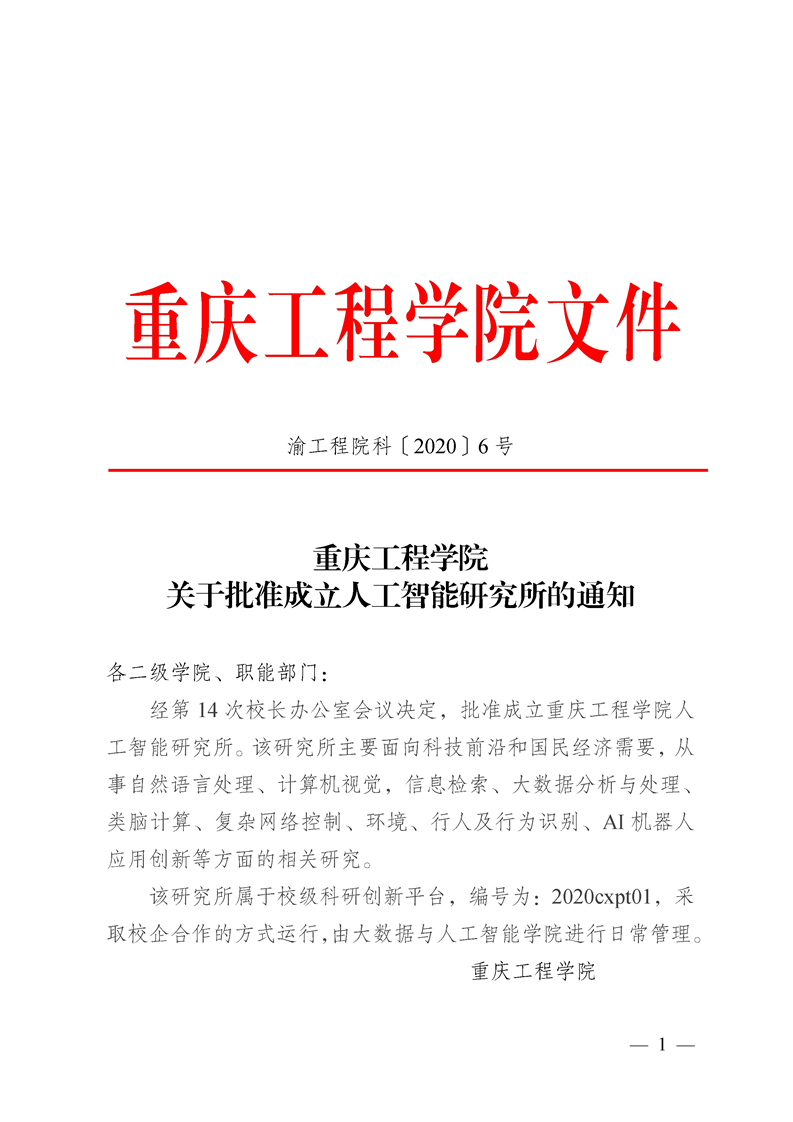 重庆工程学院 关于批准成立人工智能研究所的通知