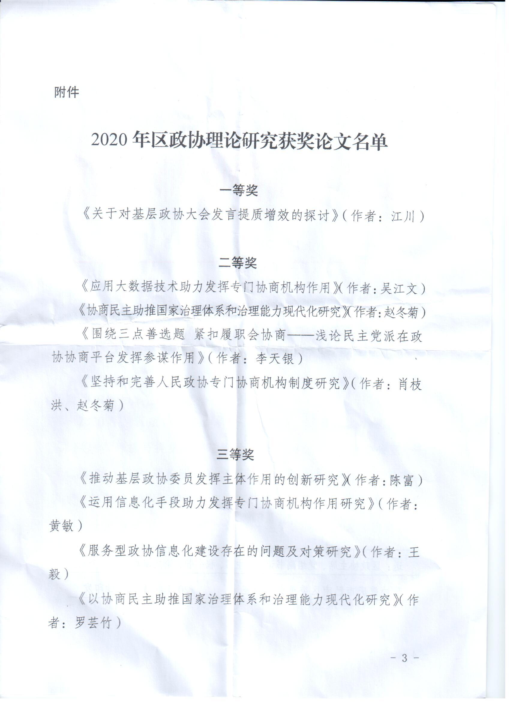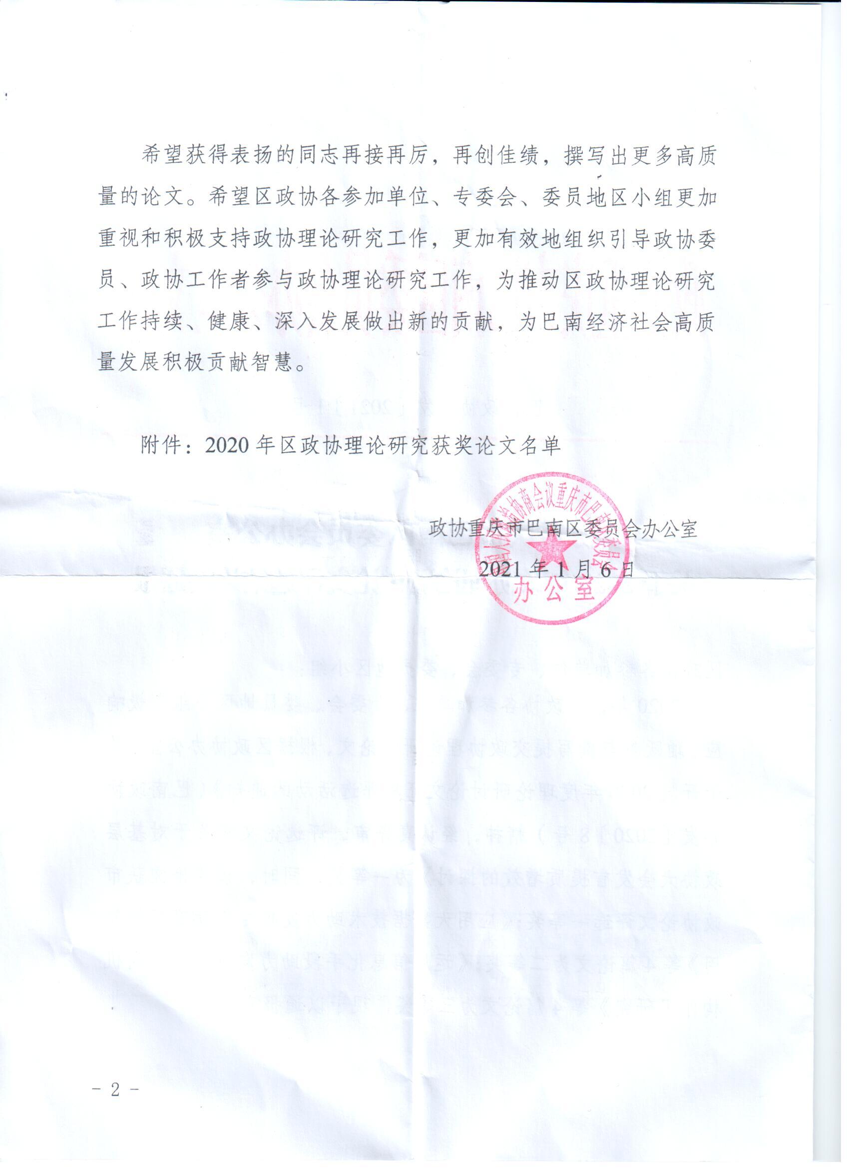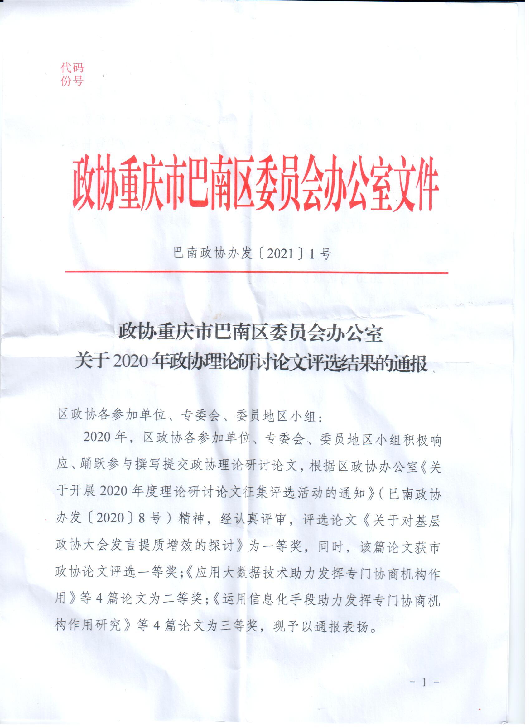 本网讯(文/江秋琰 图/夏冬梅老师)2021年1月6日,根据政协重庆市巴南区委员会办公室《关于2020年政协理论研讨论文评选结果的通报》文件,我校管理学院陈富老师的《推动基层政协委员发挥主体作用的创新研究》论文获得三等奖。