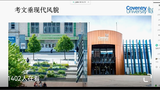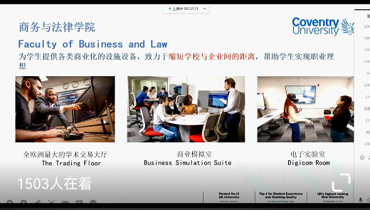 在会议中,主讲老师通过展示一些考文垂大学生活方式,饮食习惯、以及校园风光的图片来引领学生们走近这所大学,同时也介绍了考文垂大学拥有全欧洲最大的学术交易大厅,除此之外,还有商业模拟室、电子实验室等与世界相接轨的各类商业化的设施设备,缩短了学校与企业之间的聚集,帮助学生实现职业理想。