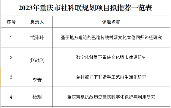 根据重庆市社科联《关于开展2023年度重庆市社会科学规划项目申报工作的通知》和学校《关于组织申报2023年重庆市社会科学规划项目的通知》的文件精神,经教师个人申报、二级学院推荐、专家组评审,拟推荐《基于地方理论的巴渝传统村落文化本位回归路径研究》等4项目申报重庆市2023 年度社会科学规划课题,名单如下: