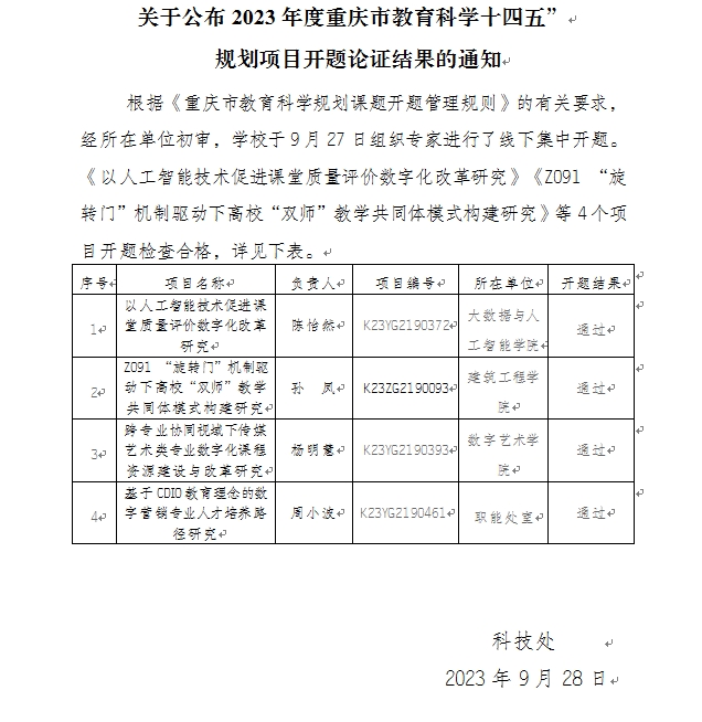 关于公布2023年度重庆市教育科学十四五” 规划项目开题论证结果的通知