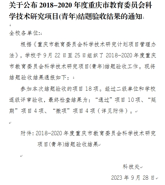 关于公布2018-2020年度重庆市教育委员会科学技术研究项目青年结题验收结果的通知