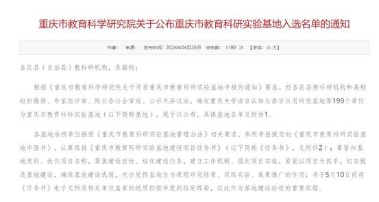 本网讯(文 大学生科研创新服务中心 杨灿)4月25日重庆市教育科学研究院官网发布《重庆市教育科研实验基地入选名单》,我校申报的2个基地成功入选,标志我校教育科研取得新突破。