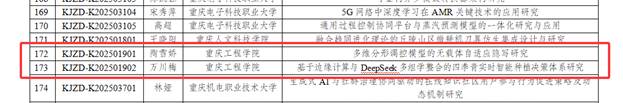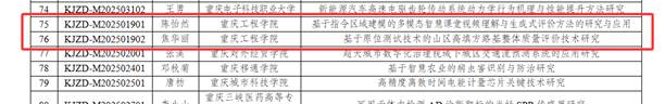 在重庆市教委近日公布的2025年度市教委科学技术研究计划项目立项名单中,我校24个项目名列榜单。其中,《基于指令区域建模的多模态智慧课堂视频理解与生成式评价方法的研究与应用》《基于原位测试技术的山区高填方路基整体质量评价技术研究》两个项目获得重大项目立项,《多维分形调控模型的无载体自适应隐写研究》《基于边缘计算与DeepSeek多组学整合的四季青实时智能种植决策体系研究》获得重点项目立项,另有20个项目获得青年项目立项,立项等级、数量,均位列区内同类高校首列。