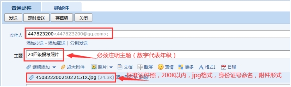 2.报名时如因无照片学籍审核未通过者,请将电子版照片按要求(标准证件照,200K以内,jpg格式,以身份证号命名后,以附件形式,如:500101199806228098.jpg)发送至447823200@qq.com,限考试报名期间,过期则无法处理。