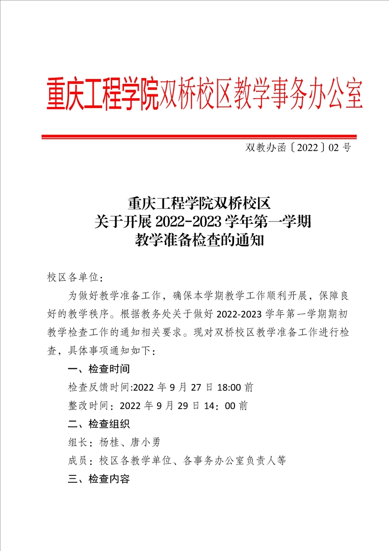 > 重庆工程学院双桥校区关于开展2022-2023学年第一学期教学准备检查的通知