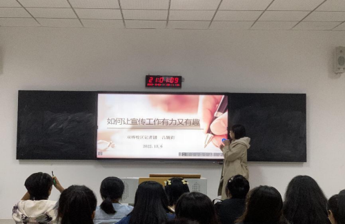 本网讯(文/图 邓颖 李侑洪)为进一步加强学生干部对宣传工作的了解与运用,加快新成员适应工作的进程,全面提高学生干部的综合素质,培养实际运用能力,10月6日,双桥校区记者团、校区团委宣传部召开了第一次岗前培训会。主讲人为双桥校区记者团指导老师、校区团委指导老师吕颖莉。