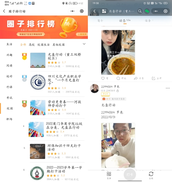 “光盘守 ‘粮心’ 勤俭我先行”劳动实践活动于10月在我校双桥校区开展。本次活动由双桥校区团委劳育实践部组织开展,共计2881人参与本次活动,总打卡50017人次,圈子“光盘行动”日均活跃度排在打卡小程序热度榜单第一名。活动过程中,同学们积极践行光盘行动,纷纷将自己与光盘的合照进行分享、上传。