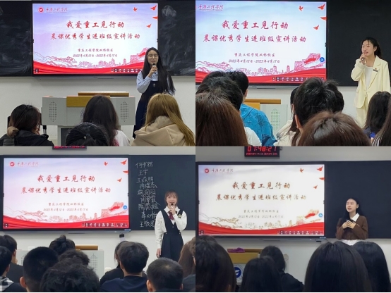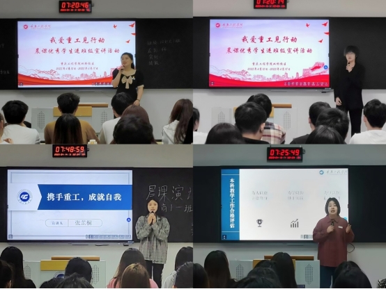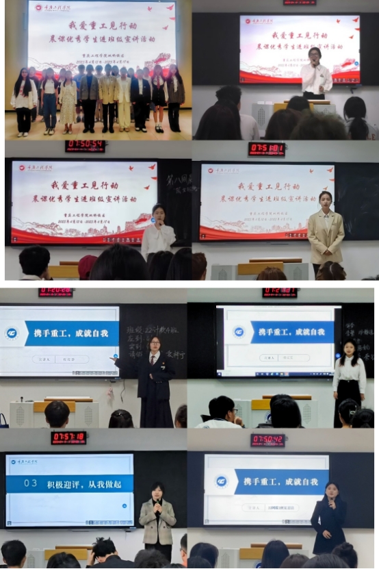 本网讯(文/图 大学生学业促进服务中心)我爱重工见行动,积极迎评勇担当。双桥校区于4月12日至4月18日组织开展了晨课优秀学生进班级宣讲活动,充分发挥青春榜样作用。