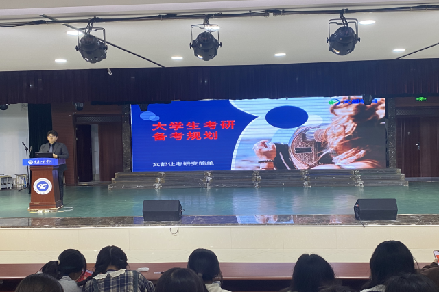 本网讯(文/图 双桥校区记者团)为帮助校区学生了解考研信息,提供考研经验,明确努力方向,赢在考研起跑线,10月25日下午,双桥校区在学术报告厅开展了“乘风破浪,筑梦未来”考研专题讲座。主讲人为文都集团重庆分公司首席规划师王丽泽。