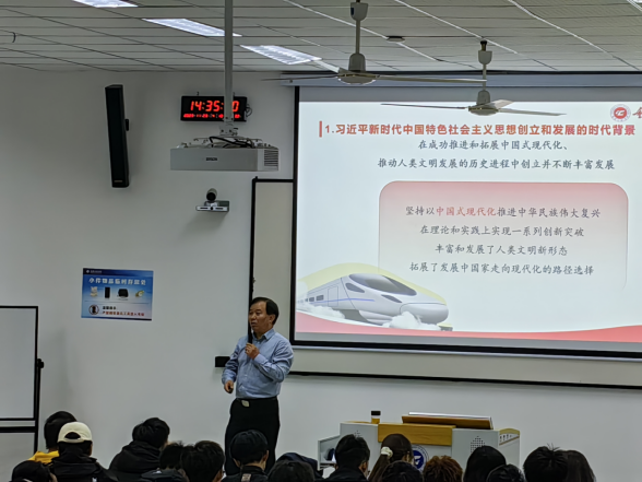 本网讯(双桥校区综合办)11月23日,学校党委副书记、双桥校区党工委书记唐小勇以《开辟马克思主义中国化时代化新境界》为主题,为电子信息学院2023级176名学生讲授了一堂深刻且富有理论深度的形势与政策课。