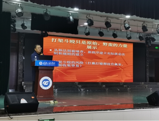 本次讲座邀请到了具有丰富实务经历的重庆泰升律师事务所殷廷伟主任。殷廷伟律师从法学的基本理论、历史沿革、我国的法律体系、与高校大学生紧密相关的法律规范和典型案例及其警示等方面进行了讲解,告诫同学们不要挑战法律的“红线”,要遵守法律规定和校规校纪,做一名知法守法的大学生。