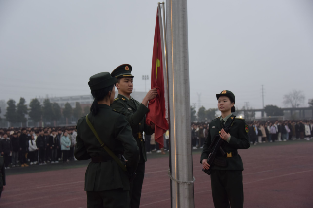 全校师生齐聚操场,精神抖擞,伴随着庄严的《义勇军进行曲》响起,英姿飒爽的国旗护卫队队员们迈着铿锵有力的步伐,护卫着鲜艳的五星红旗步入升旗台。伴随着国歌的奏响,校区师生肃立,向国旗行注目礼,齐唱国歌。
