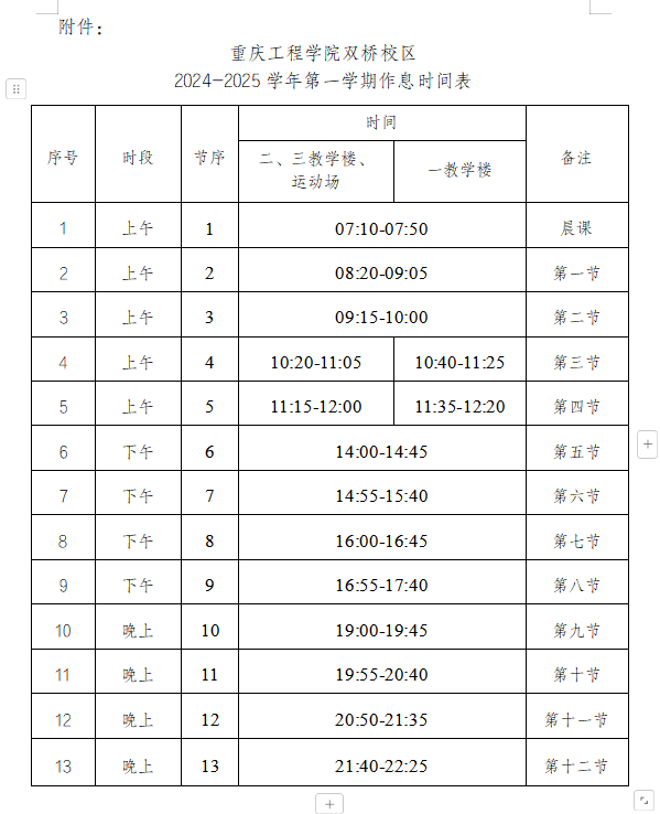 附件:重庆工程学院双桥校区2024-2025学年第一学期作息时间表