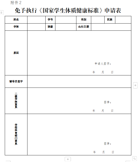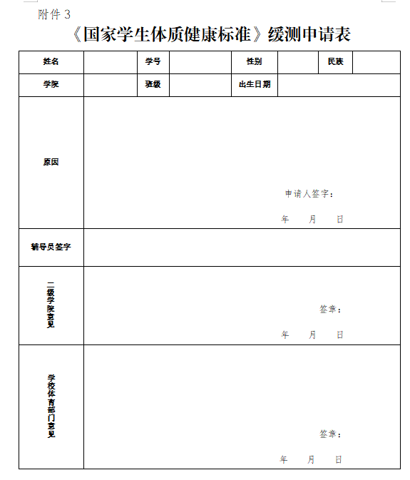 7.免测、缓测:学生因病或残疾申请免测,或由于身体不适、校外实习等原因不能按时参加体测,应在体测前向各二级学院提交《免予执行〈国家学生健康标准〉申请表 》(附二级甲等以上医院证明)或《〈国家学生健康标准〉缓测申请表》(附医疗单位证明或实习组织单位证明),由二级学院根据文件要求进行审核。二级学院于体测结束后将《免测申请表》(附二级甲等以上医院证明)、《免测学生信息汇总表》、(纸质版和电子版)交到体育教研室进行复核。相关申请表见附件。