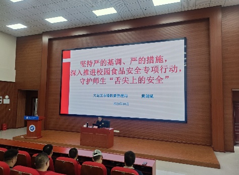 本网讯(文、图/双桥校区综合办 谭东)为筑牢校园食品安全防线,10月29日下午,双桥校区在三教报告厅组织开展食品安全专题培训会。此次培训,我们有幸邀请到大足区市场监管局食品三科科长黄剑斌来校作题为“坚持严的基调、严的措施,深入推进校园食品安全专项行动,守护师生‘舌尖上的安全’”的专题培训,校区综合办相关人员、学校餐饮经营商铺业主、食堂管理人员及员工共112人参加了培训会。