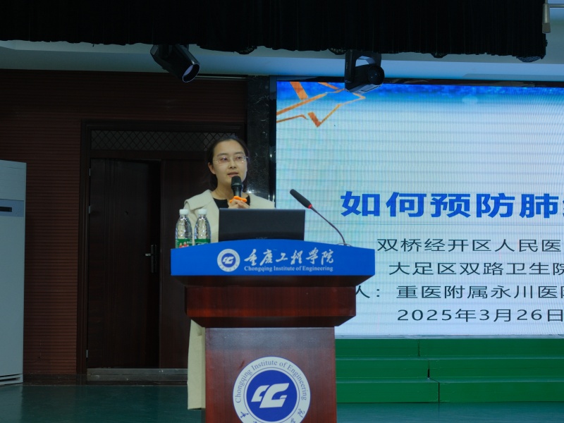 讲座现场,来自重庆医科大学附属永川医院的资深专家任丽华通过详实的案例和数据,详细介绍了肺结核的医学定义、传播路径、易感人群、感染后症状及应对,重点强调了预防肺结核的几种措施:一要注意咳嗽礼仪和手卫生,养成良好卫生习惯;二要增强体质,注意营养均衡,提高身体抵抗力,养成健康的生活方式;三要减少去往公共场所;四要做好个人防护;五要保持室内通风换气。她指出,提升自身免疫力,是防范肺结核的关键策略。她建议,同学们应做到均衡膳食,积极参加体育锻炼,保证睡眠时间充足,凭借健康的生活模式,增强身体的抵抗力,筑牢抵御肺结核的健康防线。