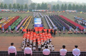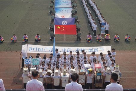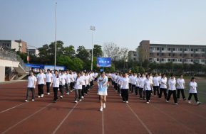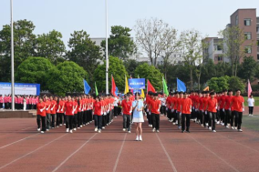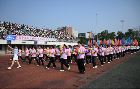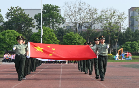 伴随着激昂的《运动员进行曲》,国旗方阵迈着铿锵的步伐率先入场。运动会会旗和校风、校训、学风方阵紧随其后。