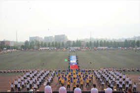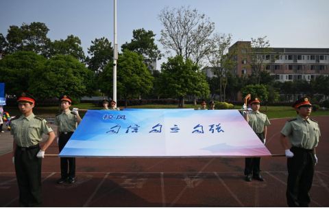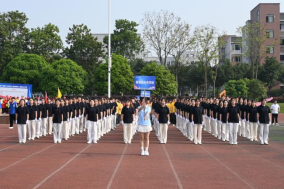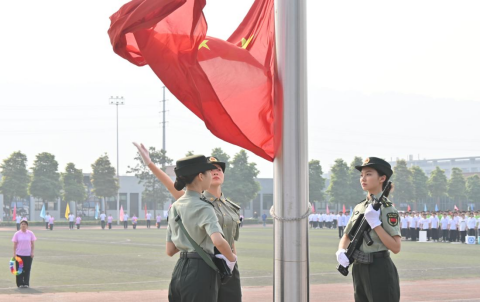 升旗仪式上,国旗高扬,国歌嘹亮,奋进旋律点燃拼搏斗志。