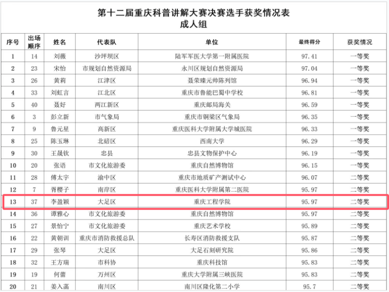 此次获奖不仅是对选手个人综合能力的高度肯定,更彰显了重庆工程学院在科普教育、实践育人与学生综合素质培养方面的显著成效,并为重庆科普事业发展贡献了重工力量!