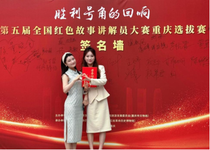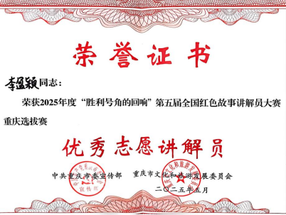 本次大赛由中共重庆市委宣传部、重庆市文化和旅游发展委员会联合主办,旨在通过红色故事讲解传承革命精神、培育社会主义核心价值观。大赛分专业讲解员和志愿讲解员两组,设置个人展示、自选讲解等环节,聚焦纪念中国人民抗日战争暨世界反法西斯战争胜利80周年,挖掘抗战故事中的民族精神。李盈颖同学在杨双溢老师的指导下,精心准备。比赛中紧扣主题,以充沛的情感和生动表达,讲述了具有地域特色的红色故事,展现了扎实的讲解功底和对红色文化的深刻理解。