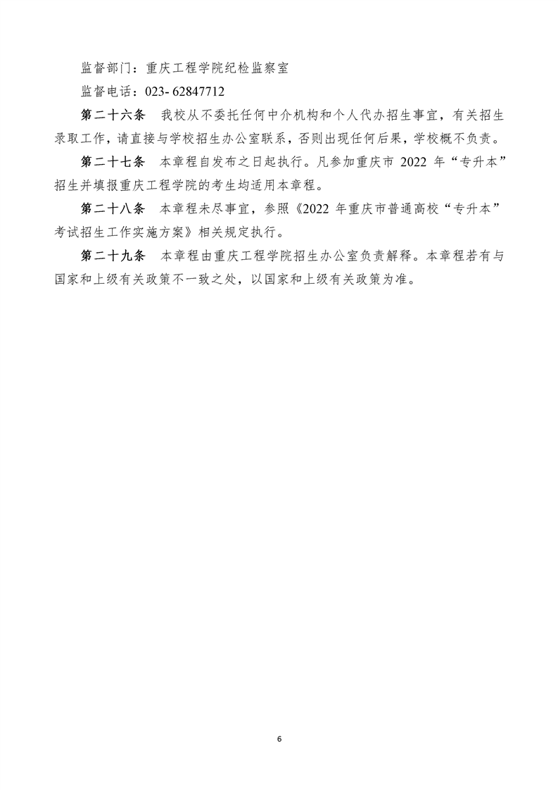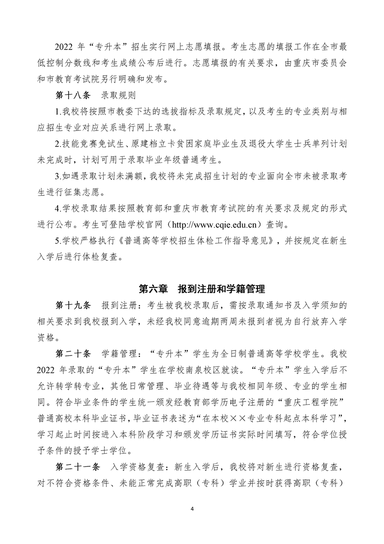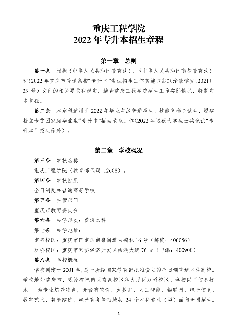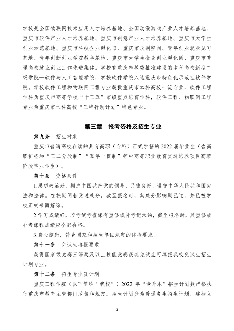 重庆工程学院2022年退役大学生士兵免试专升本招生章程