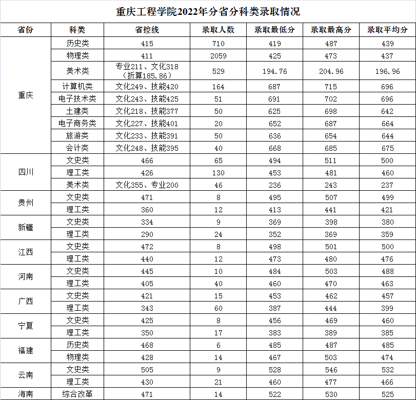 > 重庆工程学院2022年分省录取情况