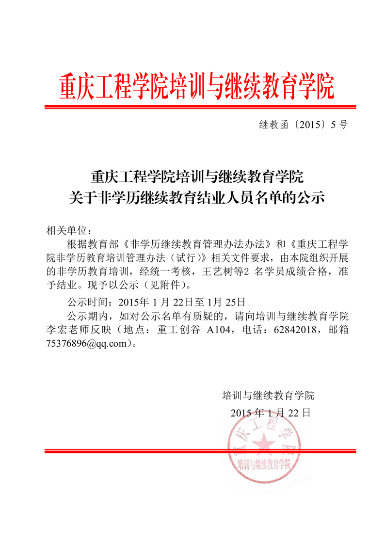 关于非学历继续教育结业人员名单的公示-继教函[2015]5号
